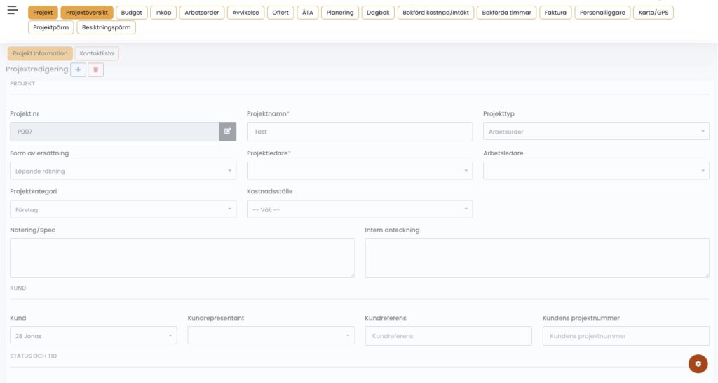 Projekthantering konfigurerad för byggflöden: planering, resurshantering och uppföljning.